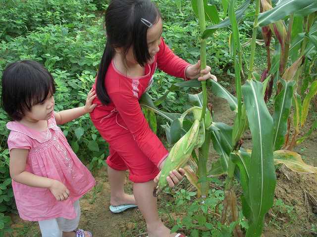 トウモロコシをもぎ取るのは、子供にとっては結構力のいる仕事です。
