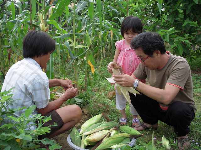 お父さん仲間のYさん家族と一緒に、トウモロコシの収穫をしました。今回は娘さんだけでなく、息子さんも来てくれました。