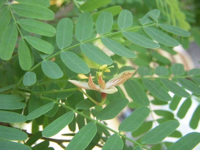 団地のベランダで盆栽にしているタマリンドの木に花が咲きました。
